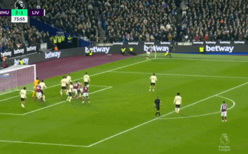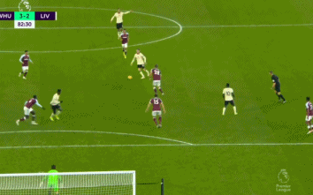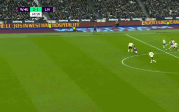 上半场两队1-1,下半场易边再战。第50分钟,西汉姆左侧角球传中,赖斯头球冲顶被横梁挡出。第52分钟,罗伯逊左路传中,马内凌空垫射踢的太正被法比安斯基挡出。第67分钟,利物浦中场被断球,鲍文抢断后开始带球,带到前场送出直塞,福纳尔斯前插得球后单刀带到弧顶,面对阿利松推射,球被阿利松扑了一下还是进网,西汉姆2-1再次超出比分。