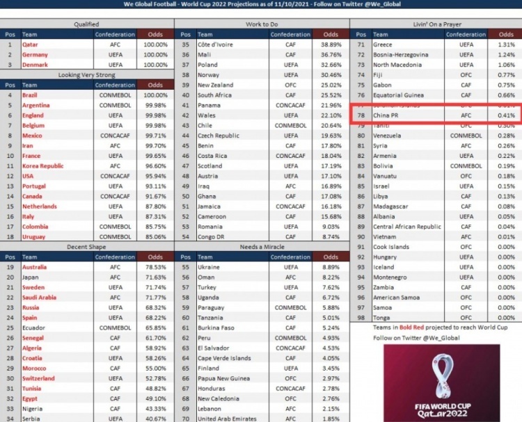 其中,国足闯入2022世界杯的可能性为0.41%,被分在了“活在祈祷中”。
