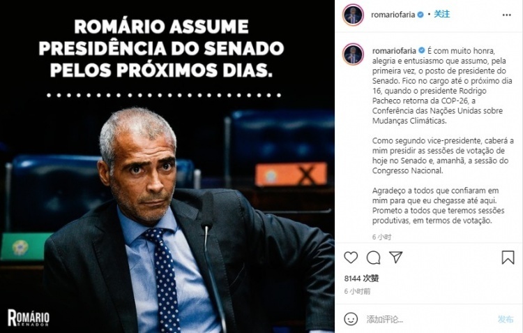 因为巴西参议院议长罗德里戈-帕切科前往英国参加联合国气候变化大会,现任该国参议院副议长的罗马里奥将暂时代理参议院议长的职务,他日前更新自己的社交媒体感谢公众的支持。