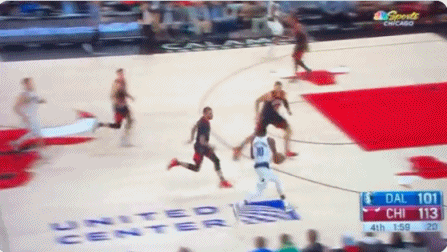 末节还剩1分50秒时,公牛完成精彩的一防一攻,先是卡鲁索摔倒的情况下仍然完成抢断,之后鲍尔后场长传,拉文快下360度转身暴扣!