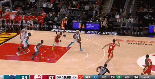 黄蜂发动快攻,乌布雷带球推进,面对三人防守,连续变向,最后折叠双手暴扣得分。