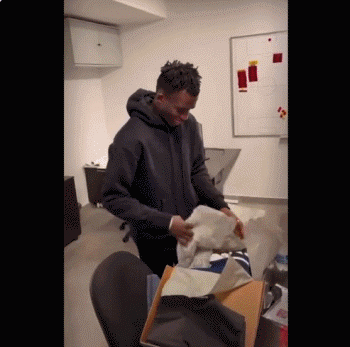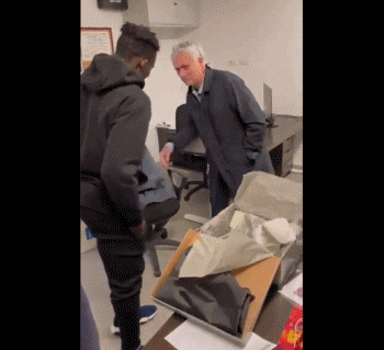 吉安从袋子中拿出一个鞋盒,又从鞋盒中拿出一个以蓝色为主色调的休闲鞋。吉安笑着感谢了穆里尼奥,他与狂人拥抱致意。随后穆里尼奥要求吉安试试鞋,吉安有点羞涩的穿上了这双鞋。