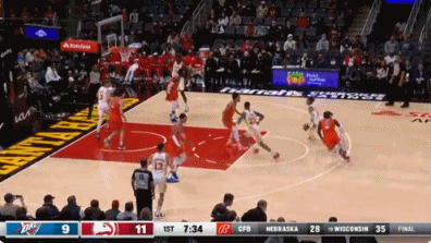 在进攻中特雷-杨将球高抛,科林斯在空中力压厄尔双手摘球,随后空中略作调整换为单臂,隔着对手将球扣进!