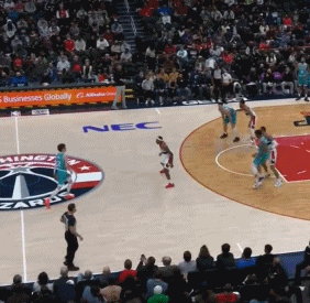 次节比赛的一个回合中,黄蜂进攻,三球弧顶位置运球一步过掉波普,随即杀向篮下完成双手扣篮。
