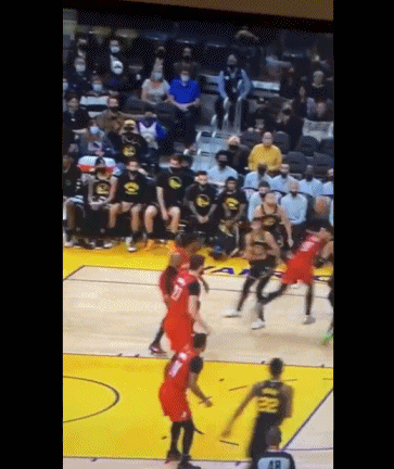 库里先是在底角面对两人命中了三分,且他被对手两人的扑防推倒在了板凳席前方,裁判没有任何表示;