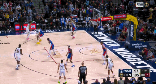 末节最后1分多钟时,掘金进攻,阿隆-戈登左侧持球突破,晃倒加福德后完成双手灌篮。
