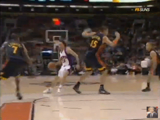 回到太阳的半场,纳什马上要了一个挡拆,换防之后直杀篮下,库里着急忙慌往篮下补防,他起跳冲过了头、还妄想转身封盖——2+1!