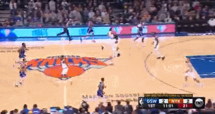库里有些较劲,他贴着纳什移动到底线,然后迅速反跑回到弧顶——三分出手——球还没有下落,库里已经开始退防了。