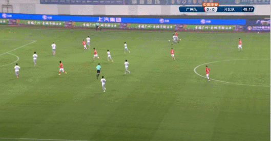 第49分钟,邓涵文中圈右侧分边,张琳芃右路套边送出精准传中,韦世豪高高跃起头球冲顶破门,广州队1-0取得领先。