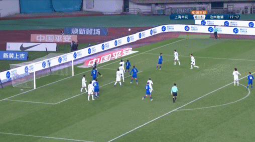 第8分钟,申花前场进攻,王毅右路传中,杨旭凌空端射未能命中门框范围以内。