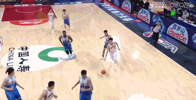 第二节比赛中段,上海队后场得球快攻反击,身体天赋出众的郭昊文持球猛冲篮筐,但他跃起上篮时,快速退防的齐麟候个正着,空中对抗将这记出手帽掉。
