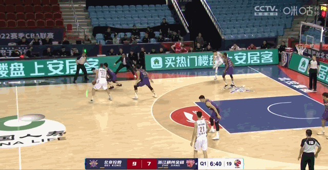首节比赛战至6分多钟,北控队在接近中线的位置,对浙江队的持球队进行了盯防。此时马布里站在场边,弯下腰来紧盯着对方球员,来回不断地滑步示意防守动作,大有恨不得自己上去防守的架势。