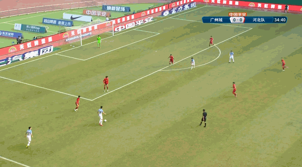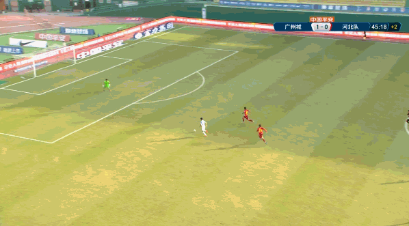 第45分钟,宋文杰单刀机会面对后卫冷静晃开角度打门球进,完成梅开二度,广州城2-0领先河北队。