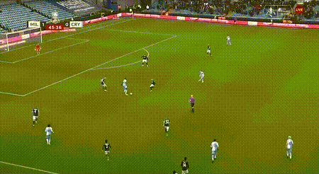 随后,两名米尔沃尔球员立刻上抢,这让巴特兰陷入了紧张。在两个对手的逼抢下,他忙中出错,传给队友的球力度太小了,轻松就被对方球员阿弗比断下。紧接着,阿弗比推射空门得手,水晶宫0-1落后。