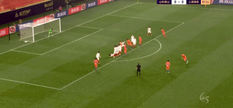 第82分钟,金敬道赢得弧顶前任意球,郑铮主罚任意球直接打门,皮球击中横梁弹回来,颜骏凌奋力将球打出来,大禁区弧顶前右侧的贾德松迎球右脚爆射直入球门死角,山东泰山1-0领先。
