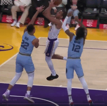 莫兰特在对阵湖人的比赛中上演了精彩盖帽,他当时在前场被布拉德利抢断,但莫兰特紧追不舍地回防,送给布拉德利一记超大的双手钉板大帽。