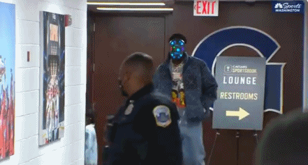 一向爱搞怪的哈雷尔今日又在入场装扮上搞了个好活,他佩戴了一个带显示屏的高科技面具,上面用走马灯播放“我回来了”,宣告复出。