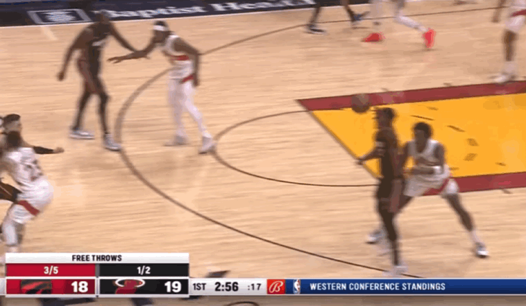 范弗里特和巴恩斯各中三分,他们率队以8-0的反击波开始第三节,猛龙队实现反超。之后两队交替得分,领先权多次易主,范弗里特弧顶投中三分,本节还有3分15秒时猛龙队以71-69领先。巴特勒和戴德蒙还击4分夺回领先,布歇连得4分,希罗毫不逊色还击7分,热火队以80-75领先5分结束前三节。