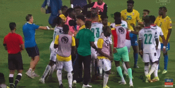 在主裁吹响终场哨后,几名加纳球员围住主裁判抗议,潘特希尔因此被黄牌警告。已经被换下的阿尤冲入场内,要找激情庆祝的加蓬教练组麻烦。双方球员们发生混战,加纳球员特特因为拳击对方球员面部,而直接被罚下。