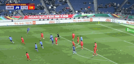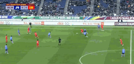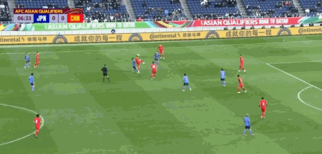 日本队将进攻线拉的非常开,因为他们具备足够的技术优势,国足必须要进行多人协防,才能进行限制。
