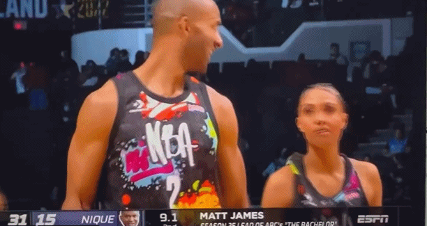 2月19日讯 NBA全明星名人赛正在进行,场上,《钻石求千金》主持人马特-詹姆斯在跟队友打招呼时,下意识拍了一下女队友埃琳娜的胸,后者当场就露出了嫌弃的表情……