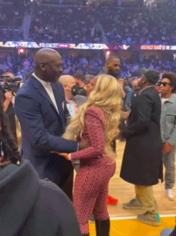 直播吧2月25日讯 美国时间上周日进行的全明星赛,乔丹在白天观看戴通纳500赛车比赛后,晚上又赶往克利夫兰参加了全明星赛中场的75大活动,活动结束后篮球之神也和现场的球星以及娱乐明星互动。