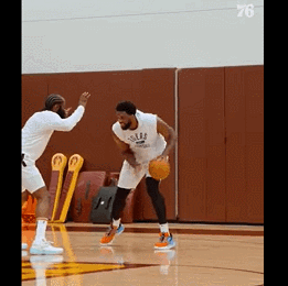 视频中,恩比德面对哈登防守,使用出后者招牌的后撤步三分并稳稳命中,之后两人还进行了一番交流。