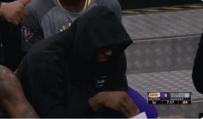 坐在场边的詹姆斯带着连帽衫吃起了爆米花,从他抖动袋子的动作来看,已经吃得只剩底了。
