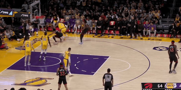 在今日第三节比赛中,詹姆斯界外救球,将球砸向倒在边线上的巴恩斯,湖人获得球权。