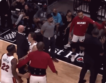 由于赛后热火对内讧详情保守如瓶,外界很难猜到究竟发生了什么,直到一位球迷在场边观众席上拍下的视频流出。