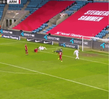 在第24分钟时,哈兰德为挪威队首开纪录。埃尔尤努西中路挑传,哈兰德禁区右侧插上。面对出击的门将,哈兰德伸出大长腿,他用左脚外脚背将球挑射入网。
