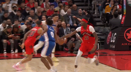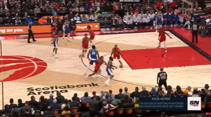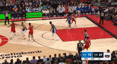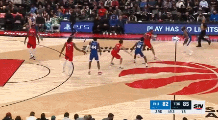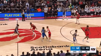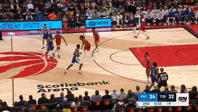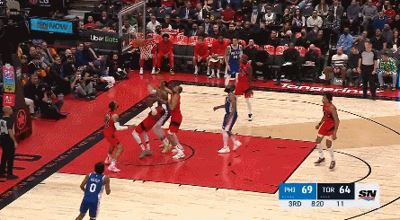 恩比德的防守同样是碾压级的,第二场和他对位的所有球员一共29投10中,第一场26投4中。所以恩比德会时不时去帮助外线防守,他确实能限制住对位球员,但是呢,人家猛龙也不傻,知道何时趁虚而入,不跟你硬碰硬。