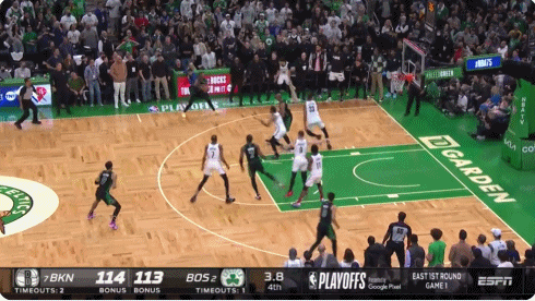 109平后杜兰特左侧底线跳投命中,第四节还有1分20秒时篮网队以111-109领先。斯马特突破不中,霍福德拿到篮板,他上篮打进,两队再次战平。欧文左翼干拔三分命中,第四节还有45.9秒时篮网队以114-111领先。凯尔特人队暂停后布朗突破得手快速追回两分,杜兰特三分不中,霍福德拿到篮板,塔图姆转身上篮打进压哨球,115-114,凯尔特人队绝杀篮网队。