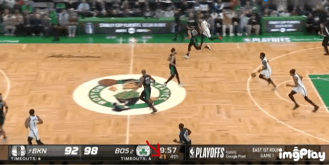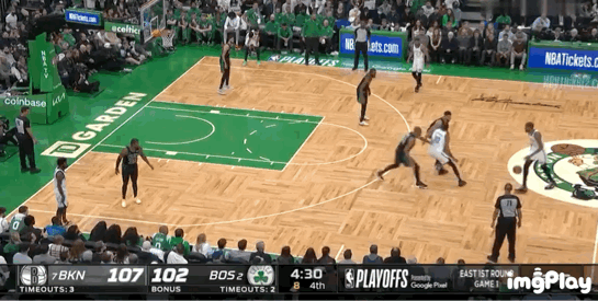 下一个回合,欧文持球,他为杜兰特设立无球掩护,让格兰特-威廉姆斯换防到杜兰特身前(格威本场比赛正负值-17)。