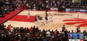 马克西突破得手开启加时赛,特伦特跳投追平。马克西跳投还击,阿奴诺比三分命中,恩比德转身跳投命中,76人队以101-100领先。阿奴诺比两罚一中追平,76人队在还有2.6秒时请求暂停。恩比德左翼命中三分,加时赛还有0.8秒时76人队以104-101领先。猛龙队暂停后来不及最后一攻,他们以3分差距惜败。