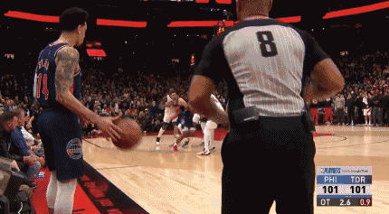 比赛进入加时,最后时刻76人一开始无法完成进攻,老里冲到猛龙替补席那边去叫了一个价值千金的暂停。