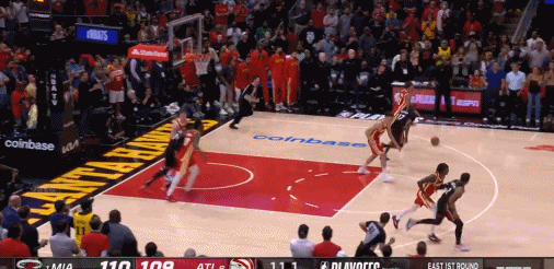 比赛最后时刻,热火进攻不中,老鹰拿到篮板直接给到特雷-杨处理,他乱军丛中冲至罚球线附近,单手抛投迎着巴特勒的防守将球抛进,反超比分,绝杀比赛!