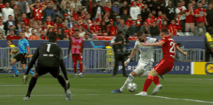 本场比赛皇马处于劣势,利物浦的控球率、射门次数、射正次数都更多。但皇马在上半场最后一刻曾由本泽马打进一球,当时皇马后场长传球,本泽马在禁区右侧拿球,将球一扣晃过回防的利物浦后卫罗伯逊,随后又假动作晃倒了出击的门将阿利森,并且将球横传到中路。利物浦球员法比尼奥和阿利森随后解围不远,巴尔韦德将球挡了一下,本泽马再次拿球后射门得分。