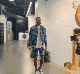 库里身着蓝色碎花T恤,面对镜头搞怪歪头依旧。