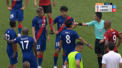 第33分钟,曹赟定侵犯埃里克再次导致比赛暂停,柏佳骏吃到黄牌,在接下来的补水时间里,亚泰球员完成补水并回到球场后,申花球员迟迟未回到场上继续比赛,马宁示意5分钟以内不回到球场,比赛将结束。