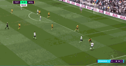本场热刺中场在上半场被狼队压制,而即便凯恩回撤到中场拿球,狼队也会采取犯规战术限制凯恩,这使得凯恩踢得很郁闷,直到第45分钟凯恩才得到了首次射门机会:佩利西奇左路传中,凯恩在和狼队中卫的较量中占据上风12码处头球攻门,球飞向左上角被门将扑出底线。这次射门也是热刺上半场唯一的射门,让热刺不至于有零蛋的尴尬。