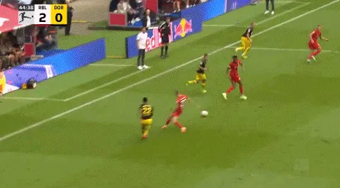 半场最后时刻,索博斯洛伊世界波破门,莱比锡2-0。