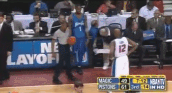 而对面的活塞队则打的比较紧张,看了看第一节20%的命中率,卡莱尔生气的把四个首发罚到板凳上看戏(只留下克里夫-罗宾逊),推上板凳匪徒威廉姆森(之前的最佳第六人)琼-巴里、和土耳其菜鸟奥库,指望用这几个人的投射缓解一下第一节堆在低位却怼不进去的便秘进攻。