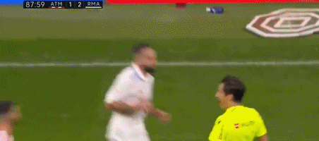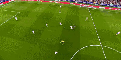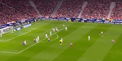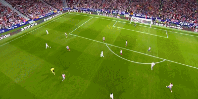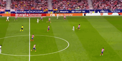 而当你看见皇马出现541这个形态、马竞又开启狂攻(未果)模式的时候,往往接下来就会看见三两脚快速的传递先稳住节奏,一记漂亮的长传再穿越身后。
