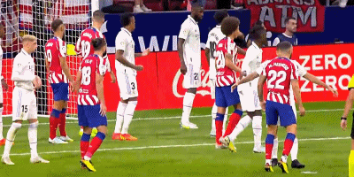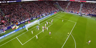 与此同时,考虑到锋线是格列兹曼+菲利克斯的灵巧组合,马竞在两条边的运动战攻势里很少第一时间直接传中,更多还是打出直塞配合之后再横传中路。但在定位球里,他们肯定也不会放过皇马防线明显的制空软肋。