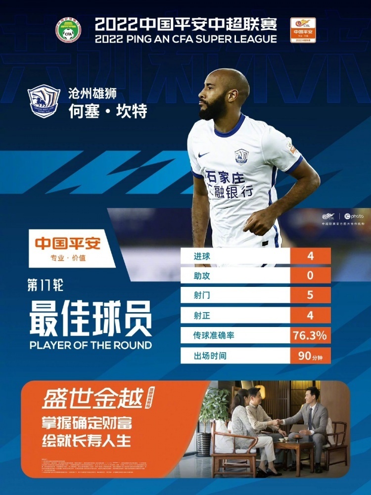 中超官方写道:在2022中国平安中超联赛第17轮最佳球员评选中,沧州雄狮队外援何塞-坎特大四喜的惊喜表现,不仅助力球队逆转赢得胜利,获得宝贵3分更是帮助队伍排名上升。