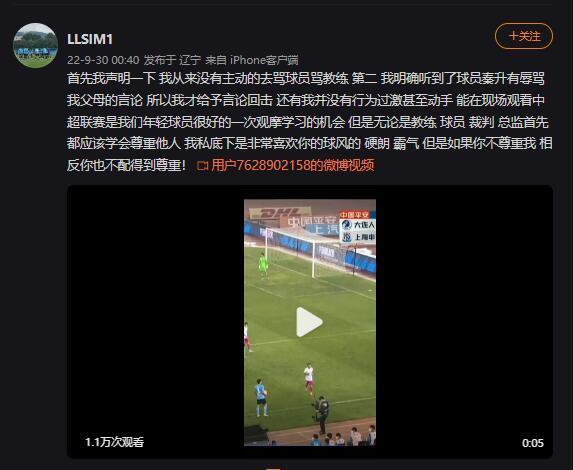不过,与秦升发生冲突的现场球童“LLSIM1”在社媒发文回应:“首先,我从来没有主动的去骂球员骂教练,第二,我明确听到了球员秦升有辱骂我父母的言论,所以我才给予言论回击,还有我并没有行为过激甚至动手,能在现场观看中超联赛是我们年轻球员很好的一次观摩学习的机会,但是无论是教练、球员、裁判、总监首先都应该学会尊重他人。我私底下是非常喜欢你的球风的,硬朗、霸气,但是如果你不尊重我,相反你也不配得到尊重!”