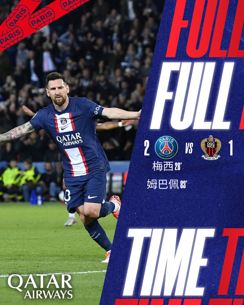 最终全场比赛结束,巴黎圣日尔曼主场2-1战胜尼斯!