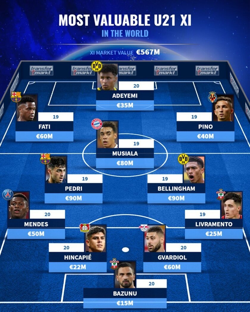 唯彩看球讯 德国转会市场今天列出U21球员最贵阵容,佩德里、贝林厄姆9000万欧元领衔。