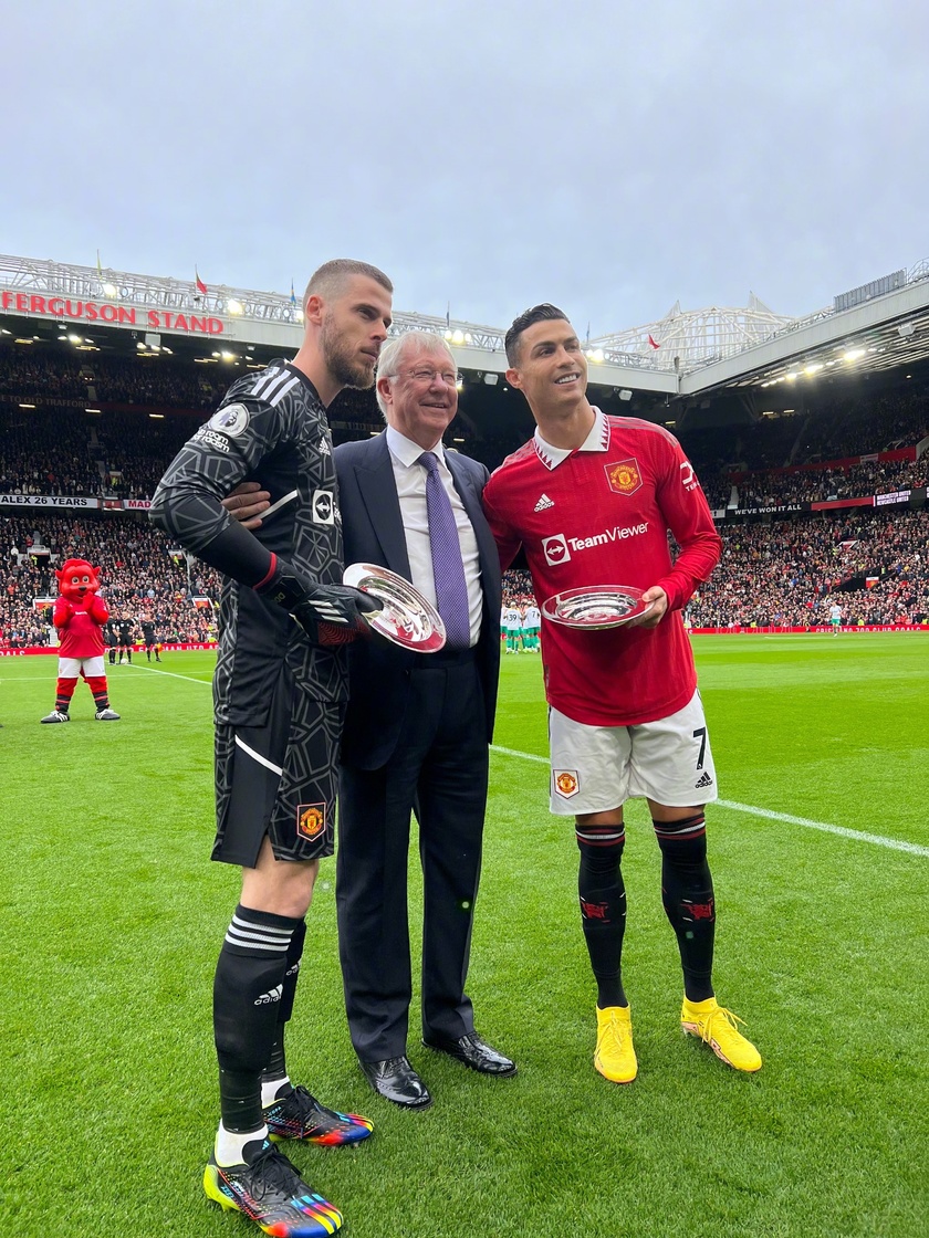 弗格森还向德赫亚颁发曼联生涯500场纪念奖盘,三人合影留念
